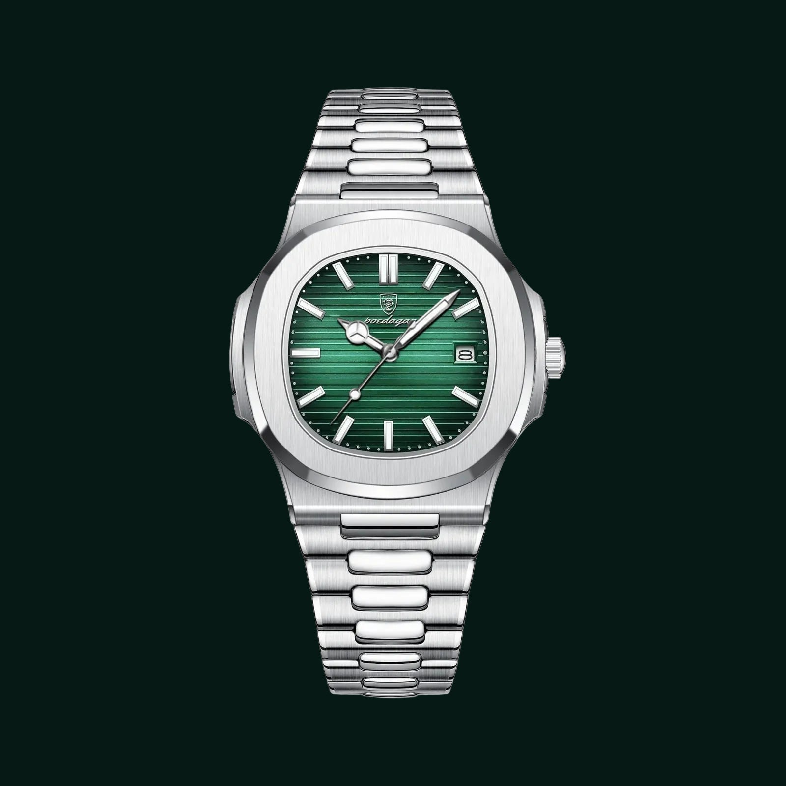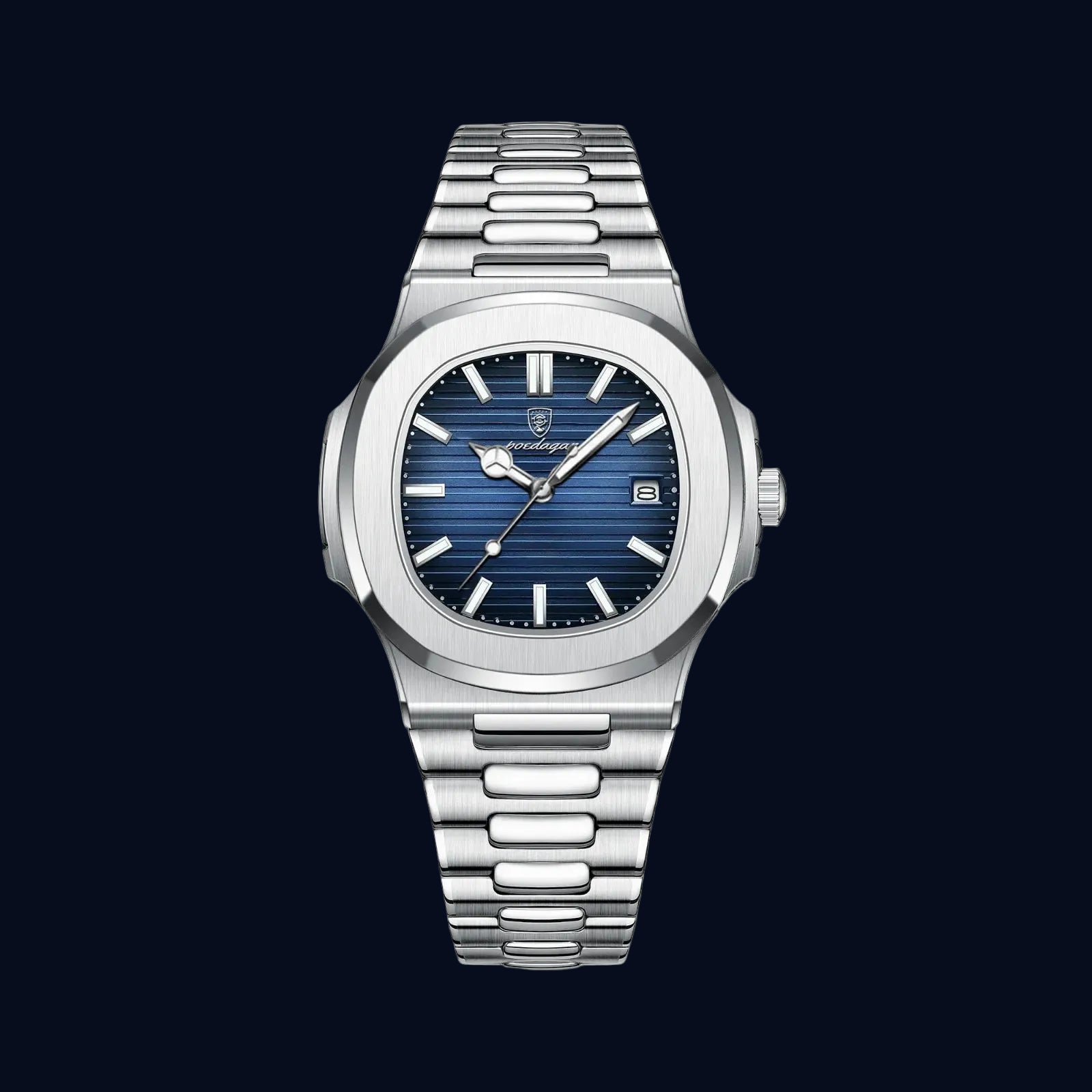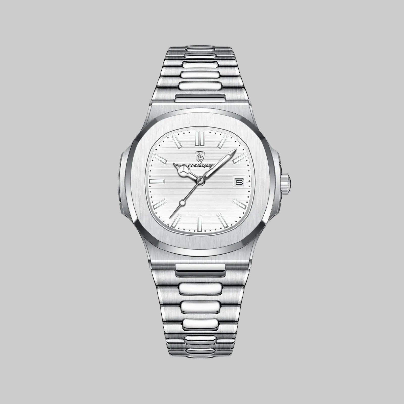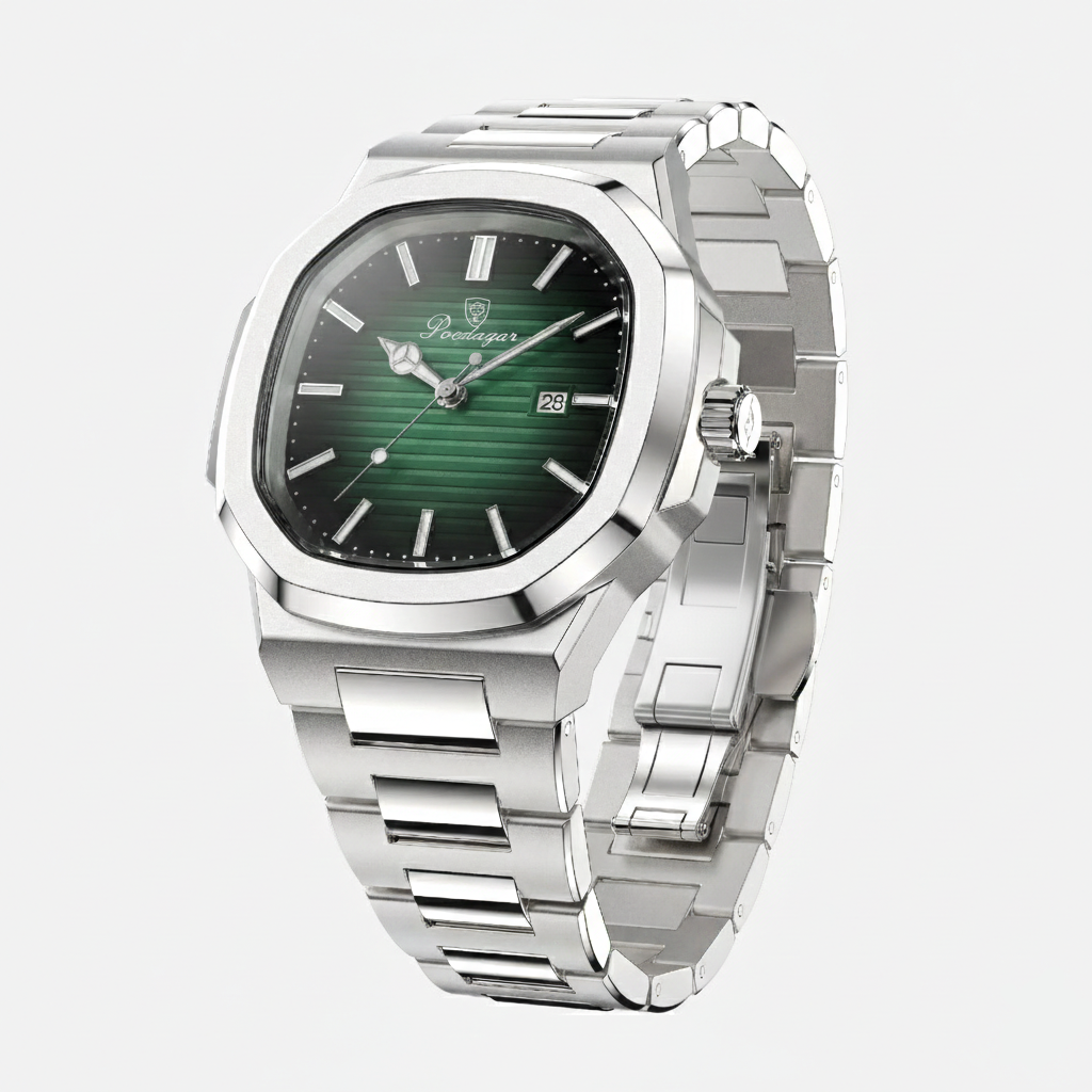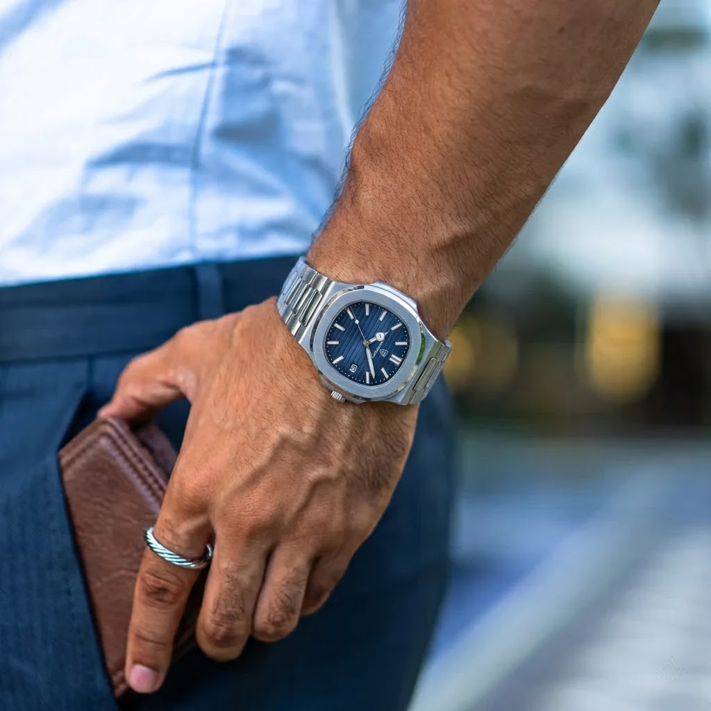 The Esoteric Ace is a clean, modern luxury watch designed for both style and daily wear. It features a recognizable octagonal bezel and a brushed steel bracelet that integrates directly into the case for a smooth, balanced look. The dial is detailed with horizontal grooves for added texture and is equipped with luminous hands and a clear date window, making it easy to read at a glance. With its slim profile and classic shape, this watch is versatile enough to transition easily from steak dinners to beachside villas