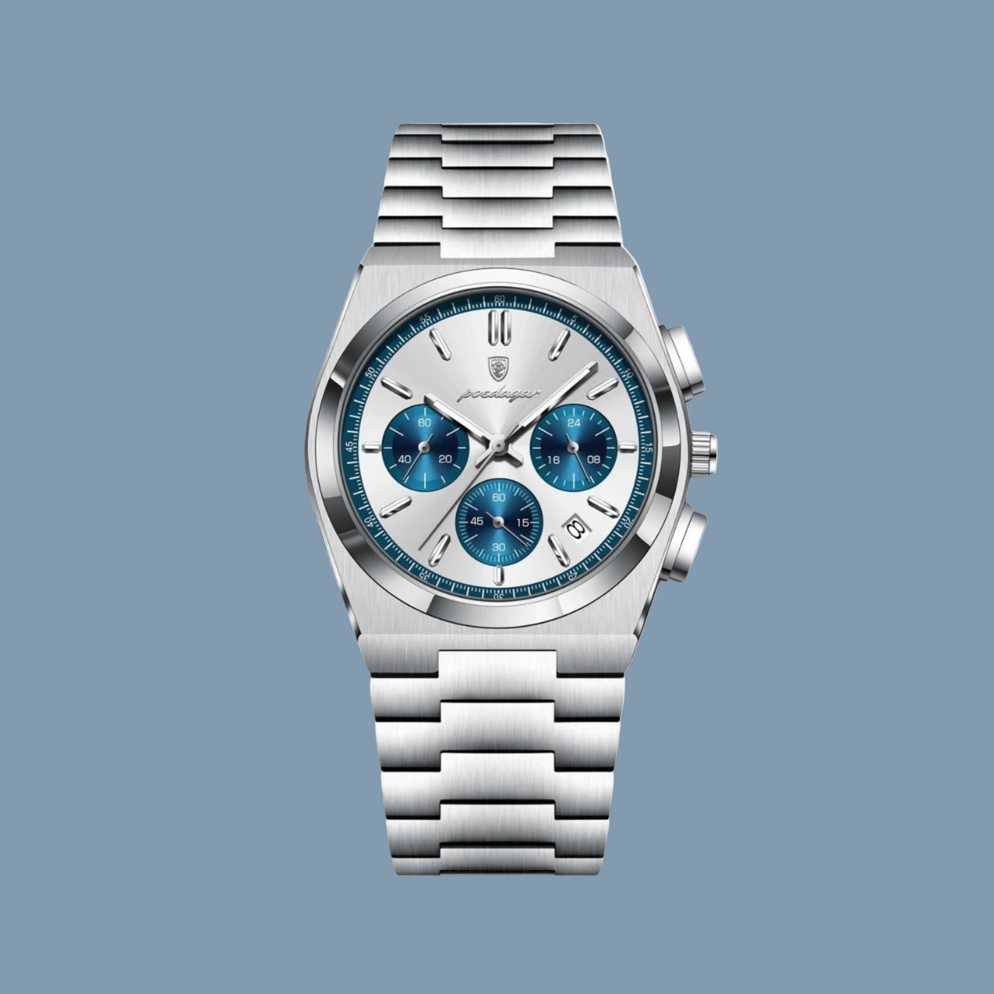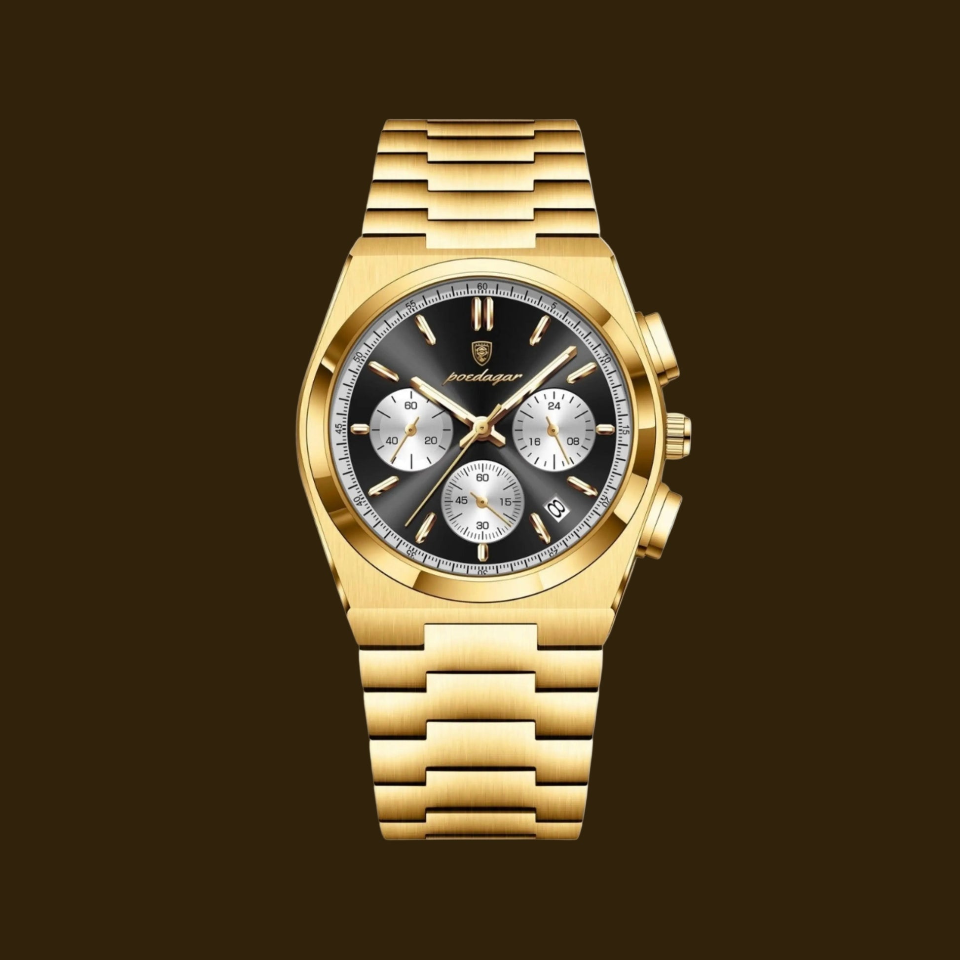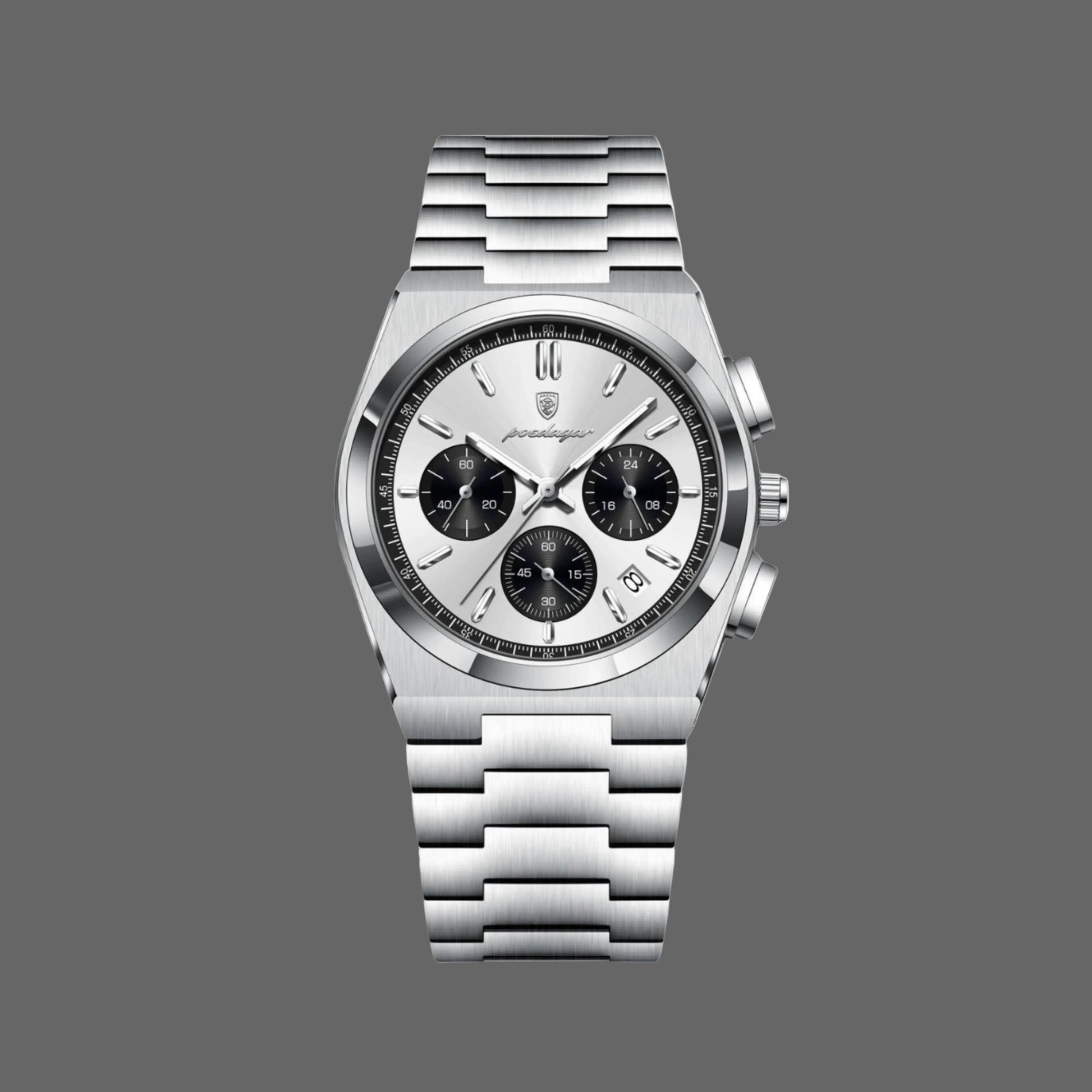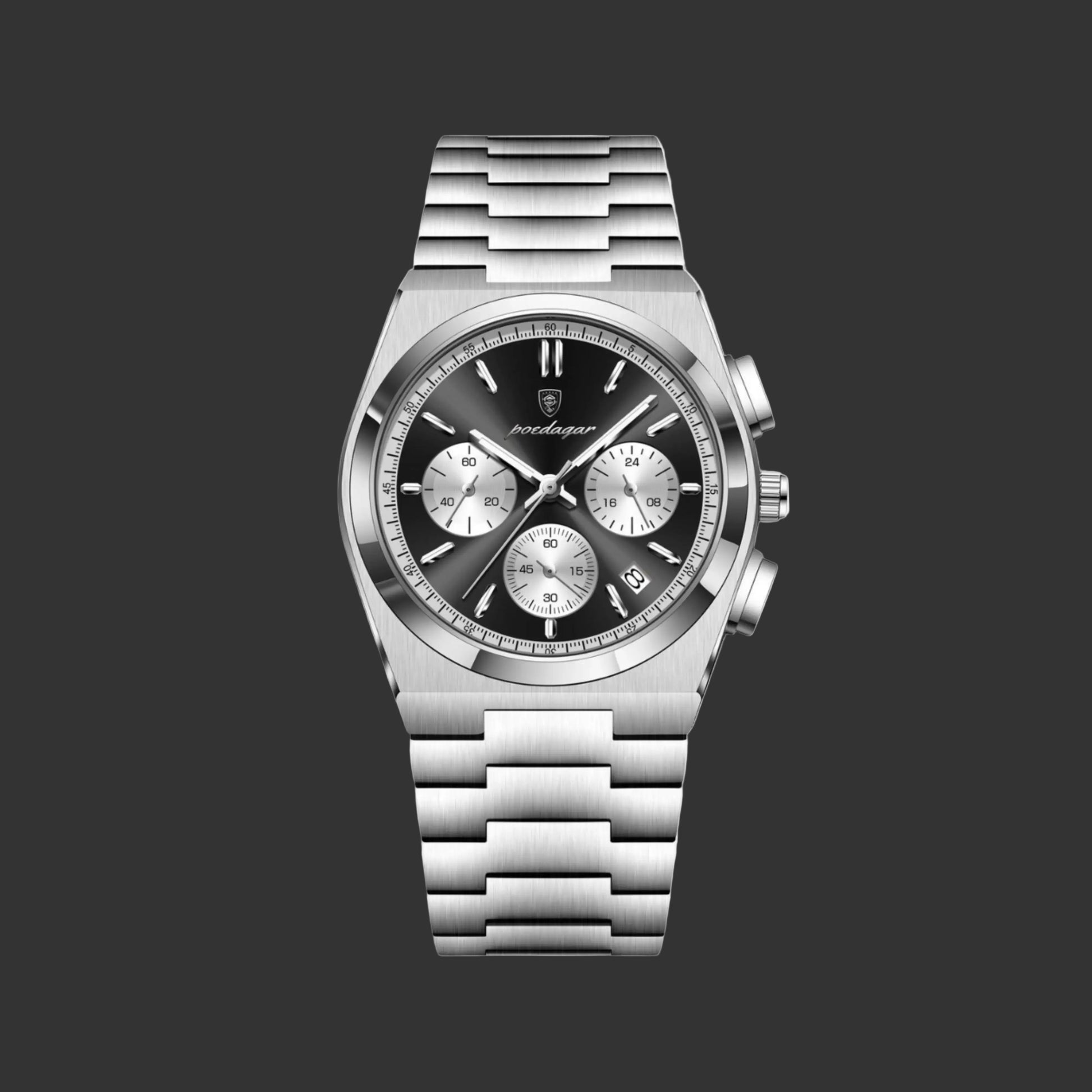 The Esoteric Classique is a sharp, classic chronograph that brings a modern touch to a traditional layout. It features a deep black sunray dial with three silver sub-dials and a discreet date window, giving it a balanced, technical appearance. The watch is built with a brushed stainless steel case and a matching integrated bracelet that flows seamlessly from the bezel, providing a clean and comfortable fit on the wrist. Driven by a reliable quartz movement and equipped with luminous hands for visibility, the Classique is a versatile timepiece that works just as well with a suit as it does for daily wear.